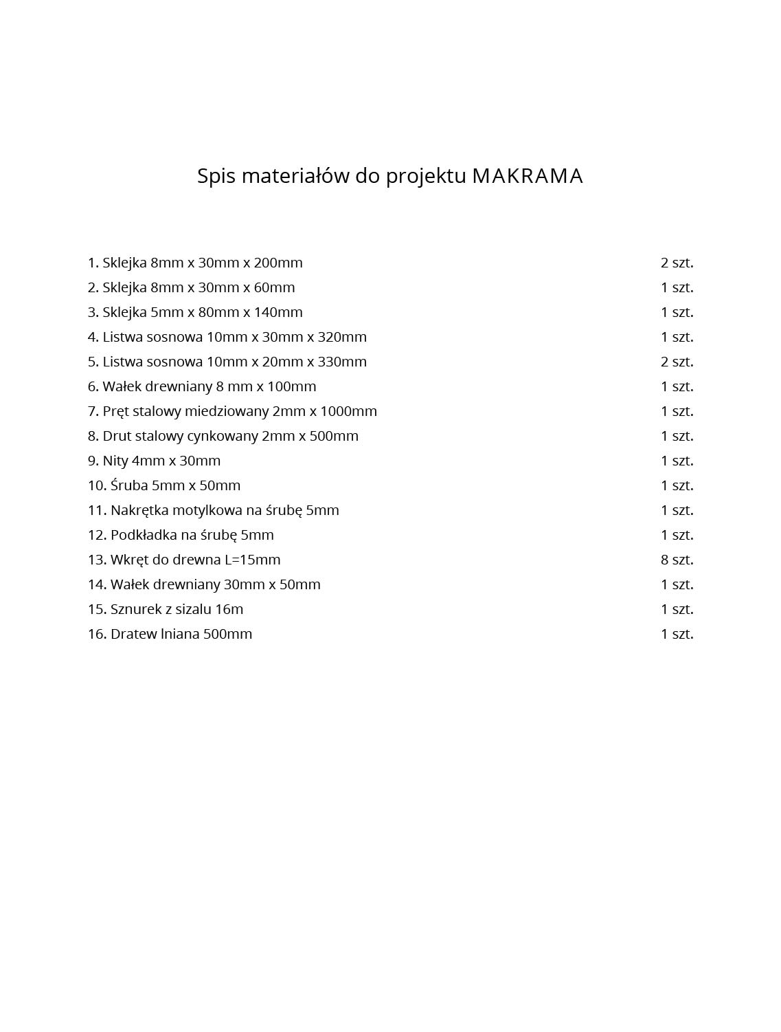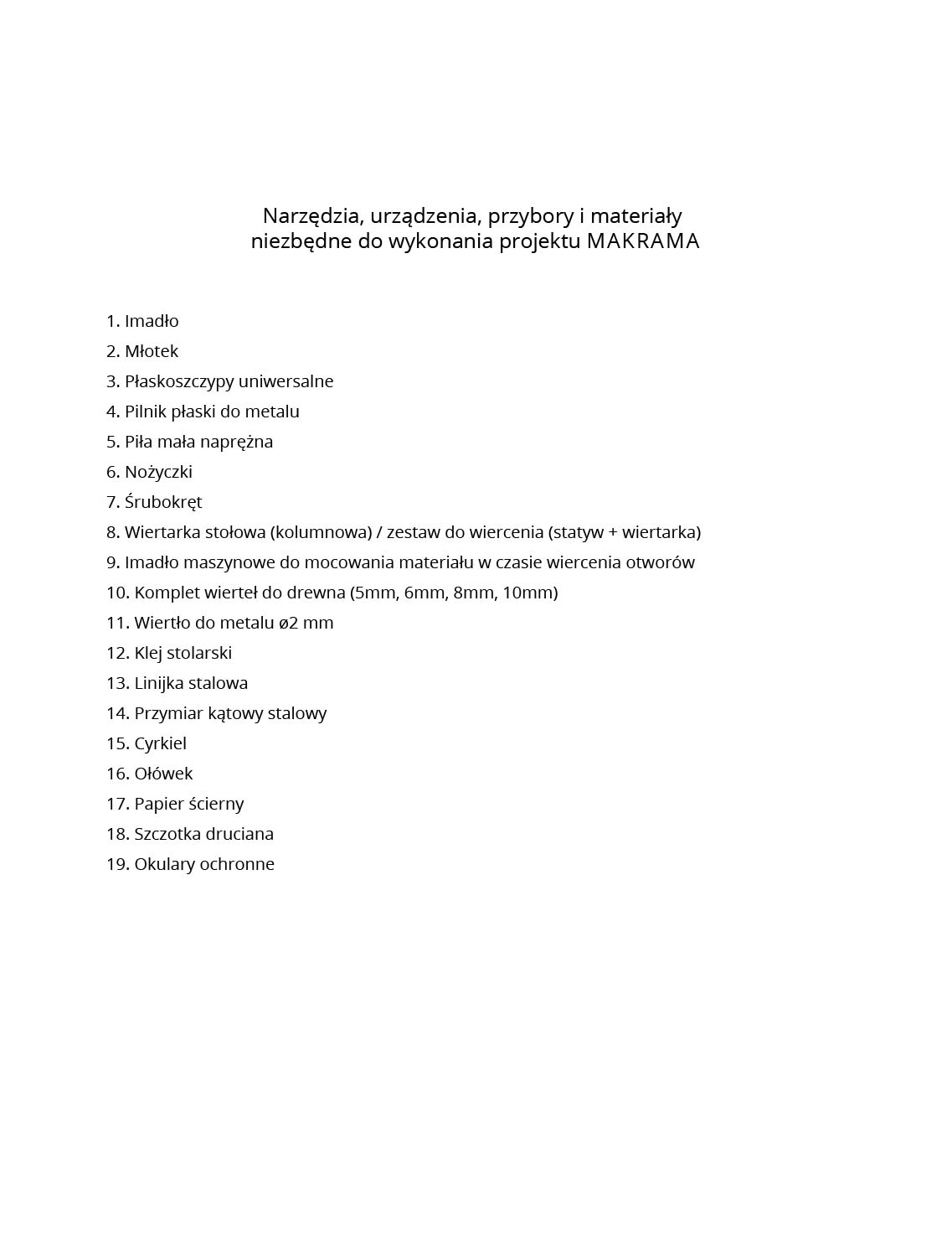 Projekt MAKRAMA zaliczany jest do grupy projektów z poziomu piątego, przeznaczonych do realizacji na zajęciach pozalekcyjnych (kółkach technicznych). Zakres wiedzy i umiejętności praktycznych związanych z projektem MAKRAMA dotyczy technologii obróbki drewna, materiałów drewnopochodnych, metali oraz połączeń rozłącznych tych materiałów. Projekt MAKRAMA ukierunkowany jest nie tylko na technologię obróbki i montażu różnych materiałów, ale także ma na celu rozbudzać zainteresowania uczniów w zakresie tworzenia makram kolistych.