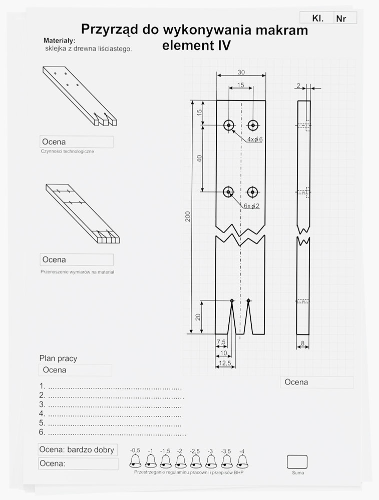 Opracowanie dla ucznia składa się z 16 kart pracy spakowanych w tekturowej teczce. Pierwsze pięć kart to strona tytułowa, regulamin pracowni technicznej, kontrakt, spis materiałów do realizowanego projektu oraz spis narzędzi. Pozostała cześć to karty technologiczne. Karty te dotyczą części składowych (tzw. podprojektów) makramy oraz ich montażu mechanicznego.